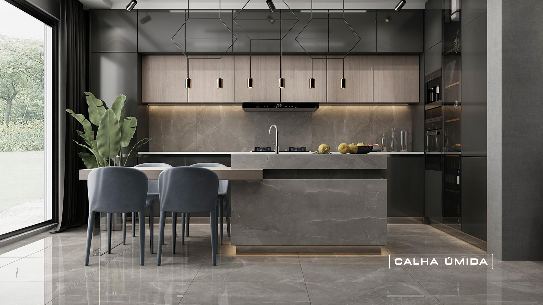 Rochas naturais como o quartzito vêm ganhando destaque nos projetos de alto padrão. Além da durabilidade, oferecem uma variedade de desenhos e relevo natural que enriquecem bancadas, ilhas e painéis. Para manter a sofisticação, prefira paginações amplas, com o mínimo de recortes e rejuntes. Combine com metais e elementos de design minimalista para deixar a textura em evidência.